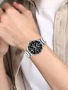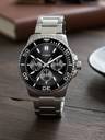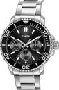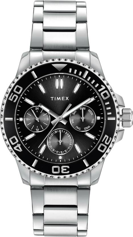 Timex Men 43mm Round Silver tone case with Black Top Ring, Multifunction watch, Black dial and Silver Stainless Steel Bracelet.