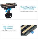 Black Anodized Aluminum Construction, Accepts cameras up to 6kg/13.2lbs, Telescopic Post extends from 52cm to a full rise height of 81cm, Camera Mounting screw 1/4" and 3/8", No of weight disc- 10, Weight of each disc-110gm, Product weighs -2.940 (with weight disc)