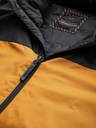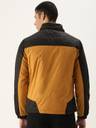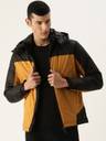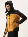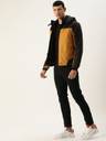 Black and mustard colourblocked bomber jacket, has a hood, 2 pockets, a zip closure, long sleeves, straight hemline, polycotton lining.
