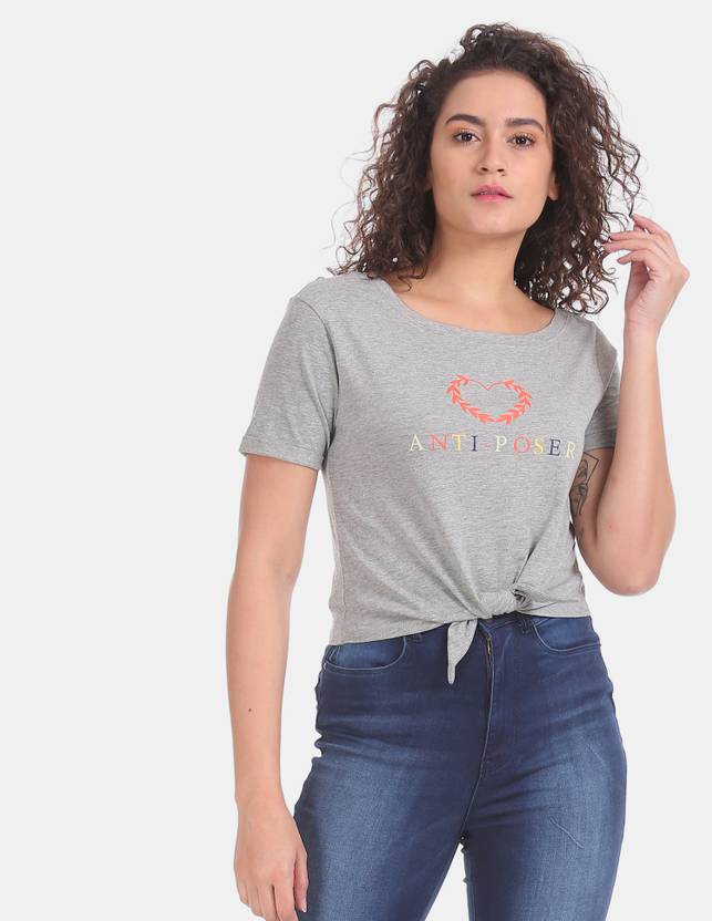 FLYING MACHINE Printed Women Round Neck Grey T-Shirt