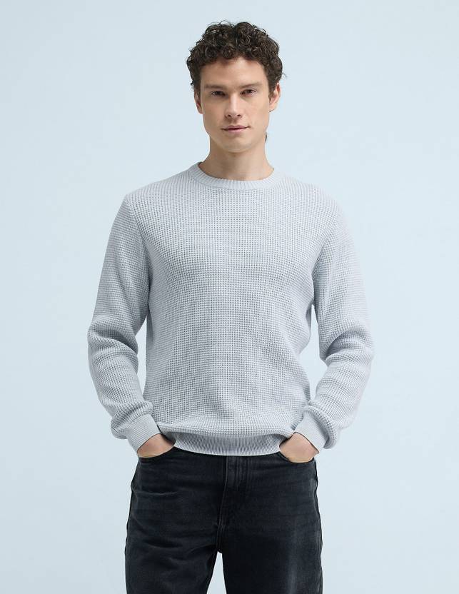 FLYING MACHINE Self Design Crew Neck Casual Men White Sweater