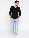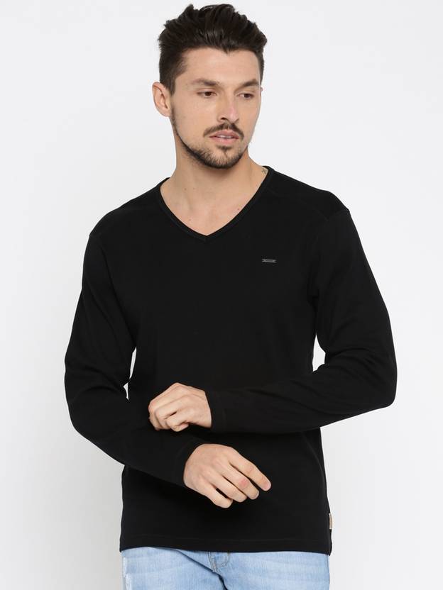 Black solid waist length T-shirt, has a V-neck, long sleeves. Upgrade your style when you take a page out of Flying Machines book with this tee. Throw on your favourite pair of chinos and loafers with this black number for a stroll around the block or casual hangout with friends.