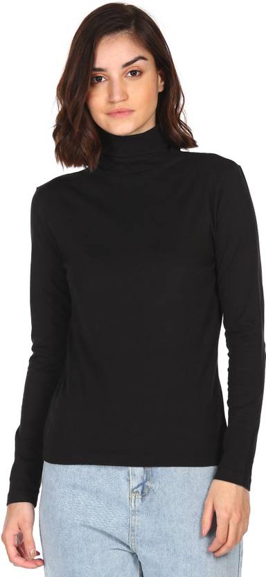 FLYING MACHINE Solid Women Turtle Neck Black T-Shirt