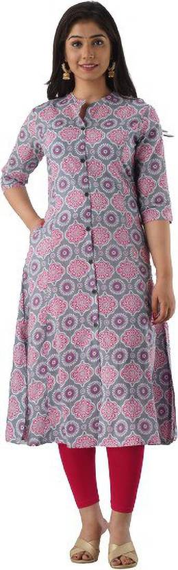 Women Printed Cotton Blend A-line Kurta (Pink)