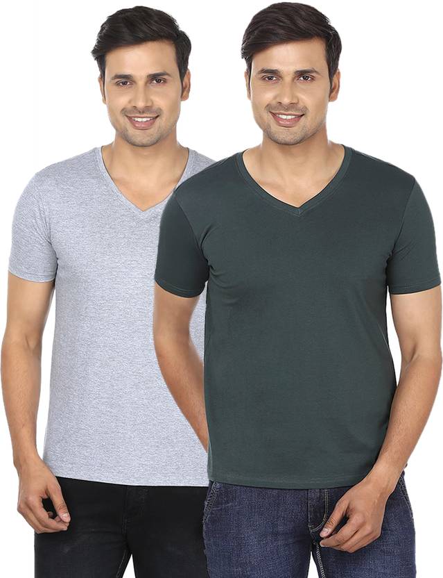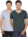 Pack of 2 Men Solid V Neck Cotton Blend Green, Grey T-Shirt