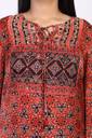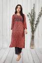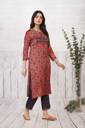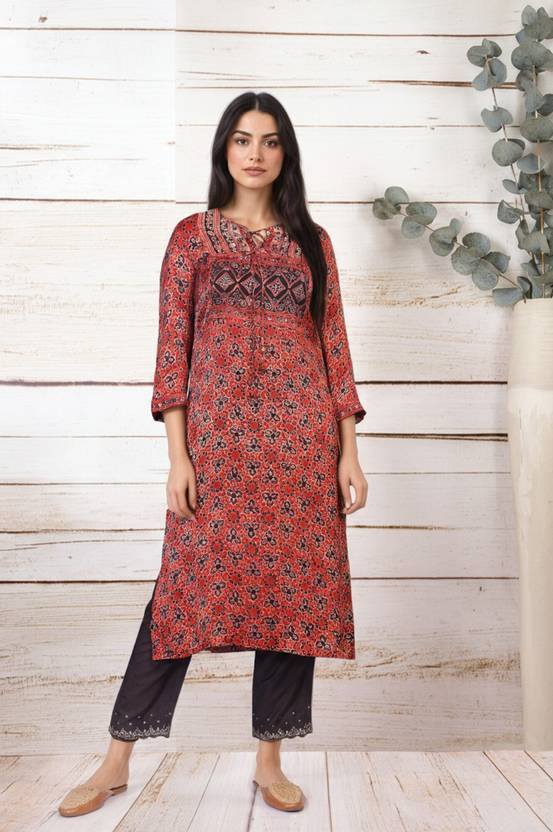 A dance of heritage and modern grace, this kurta for women in a captivating Spiced Red hue is designed to make a statement. You'll love the way its lustrous satin fabric drapes, offering both comfort and a touch of luxury for any occasion. This beautiful ethnic printed satin kurta features an intricately patterned yoke, which stands in beautiful contrast to the all-over traditional motifs, crowned by a charming tie-up keyhole neckline that adds a playful, artisanal detail. The comfortable three-quarter sleeves are finished with a delicate border, thoughtfully embellished with subtle mirror work that catches the light with your every move. Its classic straight silhouette and timeless straight hemline ensure a flattering fit for all body types, while the opaque fabric provides complete confidence and ease of wear throughout your day. This single-piece apparel is your go-to for a sophisticated yet effortless traditional look. Perfect as a tunic for women seeking elegance, this garment transitions smoothly from a day at the office to a quiet evening celebration. Pair this straight cut kurta with mirror work with dark trousers for a perfectly coordinated ensemble.