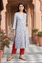Folksong Women's Blue Block Print Mirror Work Straight Cotton Kurta