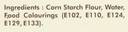 • Cocoa Butter, Synthetic Food Colours E102, E110, E133, E127).
