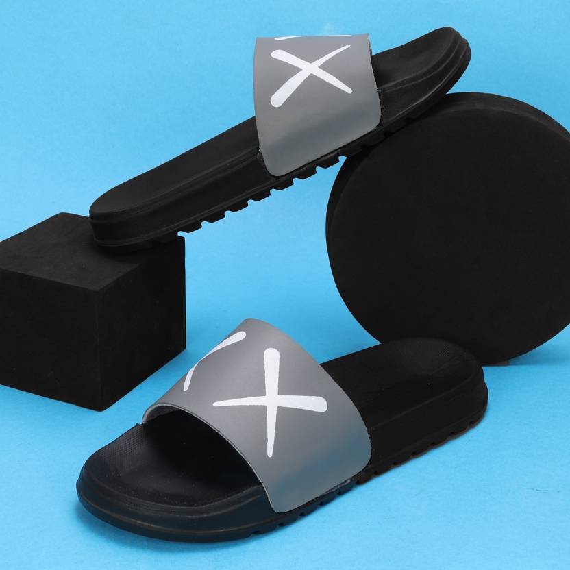 Step into comfort and style with these trendy black and grey slides. Featuring a bold white 'XX' graphic on the strap, these slip-on sandals are designed for effortless wear. The contoured footbed provides comfort, while the grooved outsole offers reliable traction on various surfaces. Made from durable synthetic materials, they are perfect for casual outings, poolside relaxation, or simply lounging at home. Pair them with shorts, track pants, jeans, or swimwear for a relaxed and fashionable look.