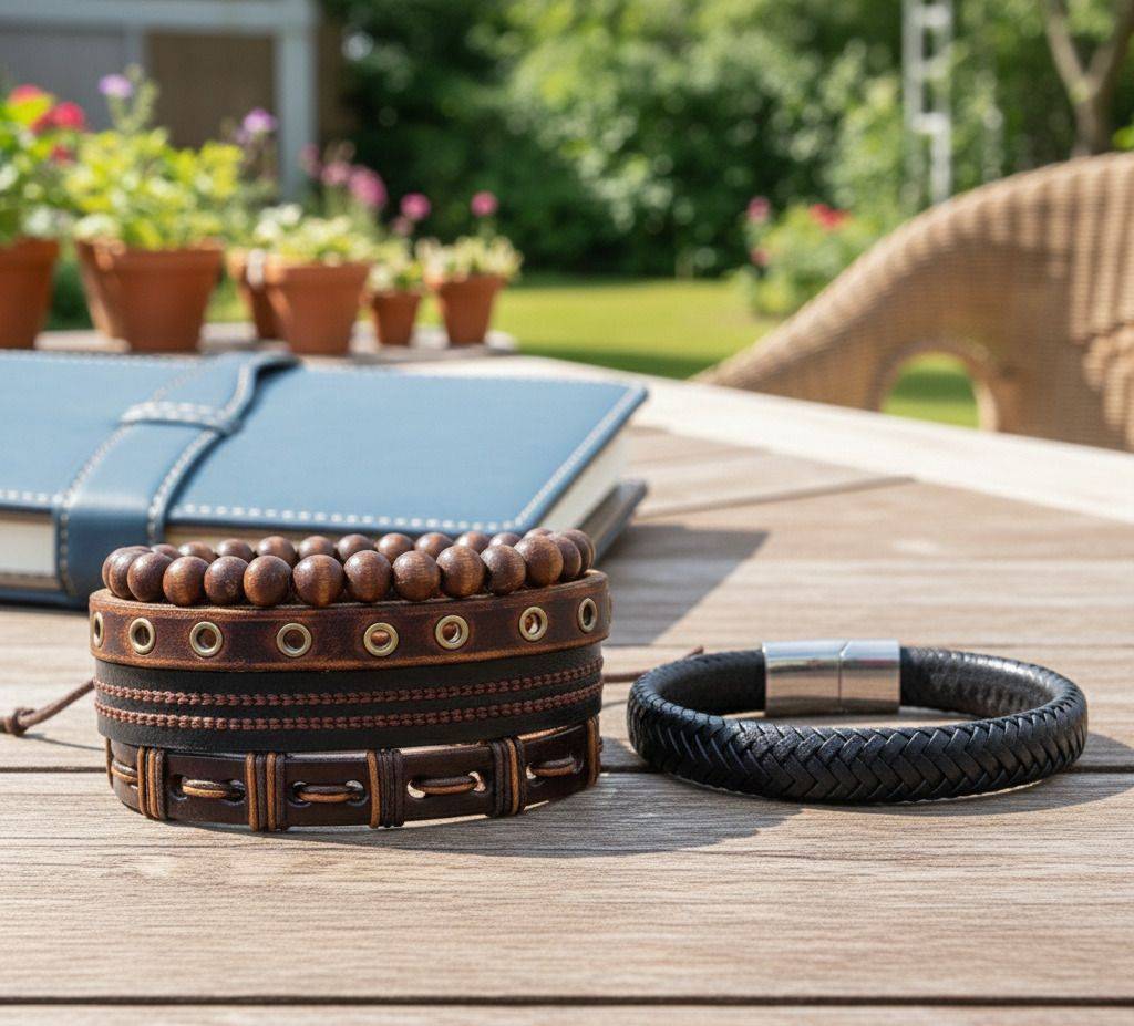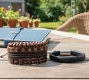 1 brown leather bracelet and 1 black leather bracelet