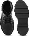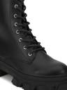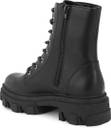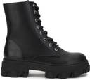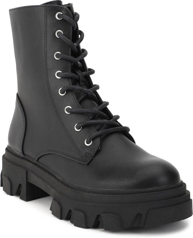 A pair of faux leather combat boots featuring lace-up closure through burnished grommets, round toe, low platform, and a lug sole.