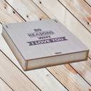 20 Reasons Why I Love You Message Pills Box, 20 Romantic messages Printed on wooden heart Packed in beautifully decorated wooden box. Every heart is having following messages 1. I am happiest when I’m right next to you 2. I need you like a heart needs a beat 3. Your love is all I need to feel complete 4. Just Seeing you smile Make My Day 5. You are my spark in dark 6. I didn’t Choose you, My heart Did 7. Kiss,Hug,Talk,Argue,Laugh and Love- That’s Us 8. Without you, I'm empty body without soul 9. You are heaven on earth 10. Loving you is like Breathing I can’t Stop 11. I like me Better When I am with you 12. Hug Harder, Laugh Louder, Love Longer 13. I need Vitamin U 14. Love is not what you say, Love is what you do 15. you are the best part of my life. 16. True Love Turns Two Soul into One 17. My favourite place is inside your hug 18. You are every reason Hope , Dream I ever Had 19. You are the water to my ocean. 20 You make me smile effortlessly,