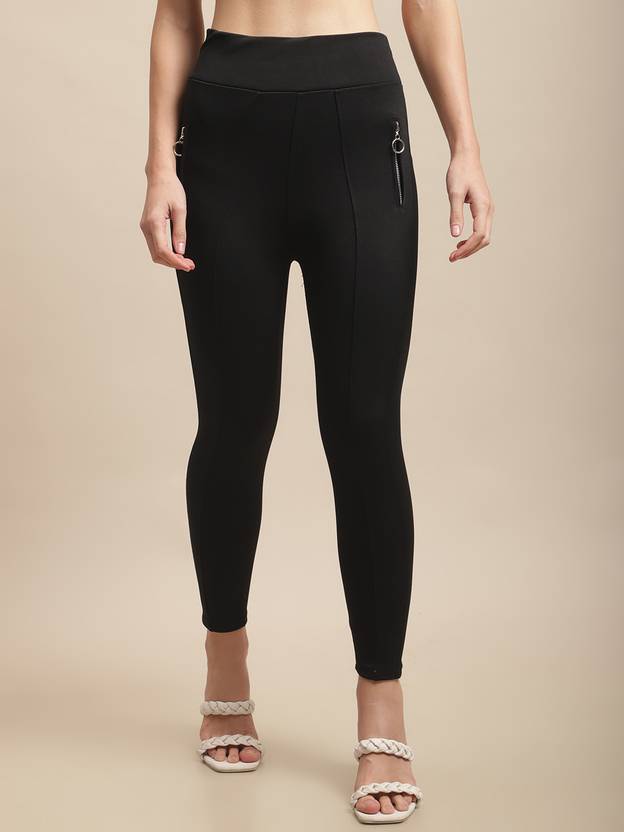 Womens Slim Fit Cotton Lycra 4 way Stretchable Jeggings With 2 Zip Pockets Style Mid Rise, Ankle Length with Elasticated Waistband