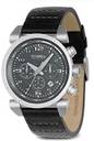 Mens casual strap watch. Features brushed silver case with dark grey dial and rotating concave top ring accented by silver indexes. Genuine black leather strap. Three-hand quartz movement. Packaged in a collectible tin. Water resistant to 100 meters. It features a black leather with stitching strap, a stainless steel case and has a grey chronograph with three hand movement and date window dial.
