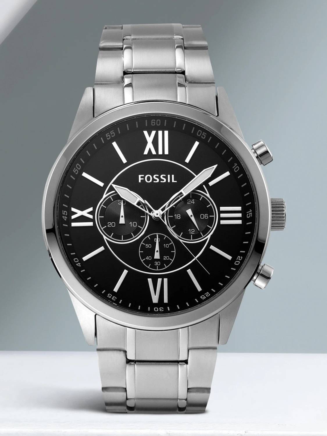 Wear the ultimate expression of Fossil style and design evolution on your wrist with this chronograph watch. Expertly crafted from stainless steel and silver link bracelet, the Flynn series watch ensures form and function for years to come. The classic black dial features a chronograph display for precise timekeeping and a date interface for easy reference.