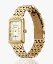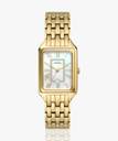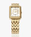A true icon from our archives, the rectangular Raquel watch is updated for the current moment. Slim and versatile, it features a mother-of-pearl watch face with a glitz inner-frame, three-hand date movement and a brushed and polished gold-tone 7-link bracelet.