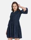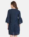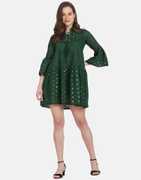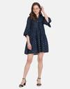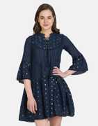 Dress Fabric: Cotton | Dress Color: Navy Blue | Dress Work: Zari | Dress Pattern: Gathered | Dress Neck Pattern: Tie-up Neck | Dress Sleeve Pattern: Bell Sleeves | Dress Inner: Cotton.