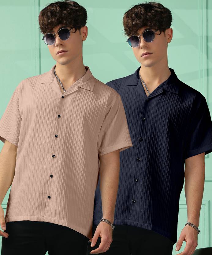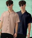FOXTER Men Self Design Casual Blue, Khaki Shirt (Pack of 2)