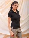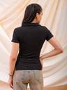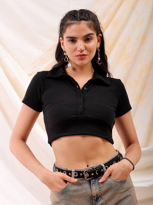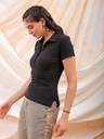Black Fitted Solid Shirt Style has a, Collared, Cap Sleeves and Straight Hemline