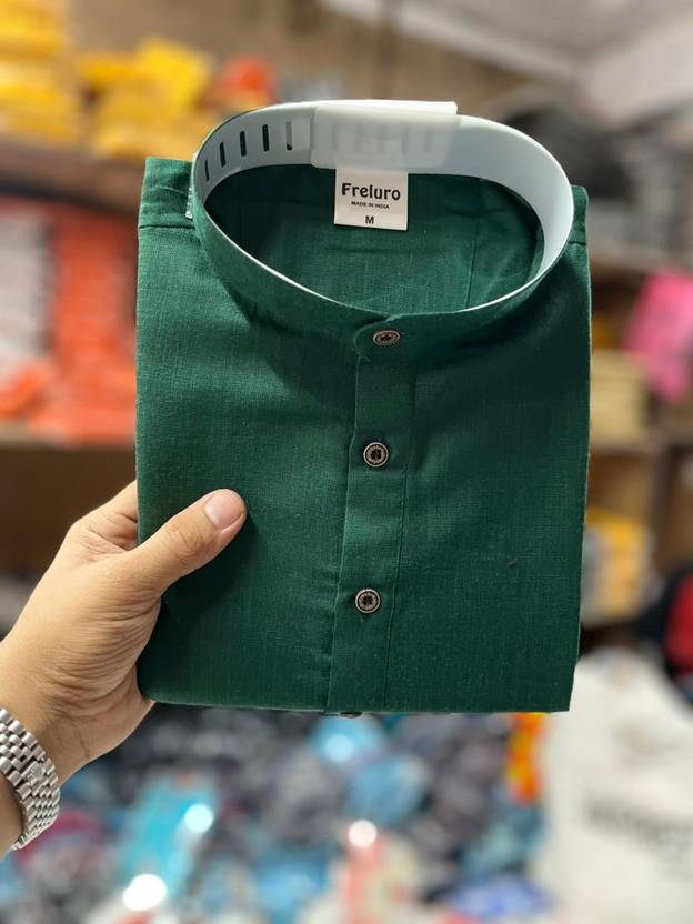 FRELURO Men Solid Cotton Blend Straight Kurta (Dark Green)