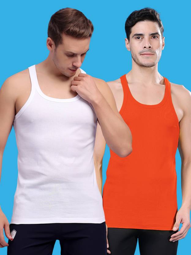 White Orange vests, has a round neck, sleeveless. This muscle vest from Friskers will provide you that extra comfort while looking stylish. Made of cotton elastane, this sleeveless muscle vest can be teamed with jogger pants for a seamless workout experience at the gym. Quick drying Extra soft fabric.