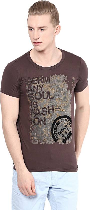 FRITZBERG Men Printed Round Neck Cotton Blend Brown T-Shirt