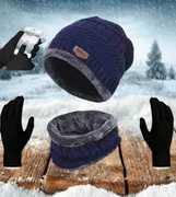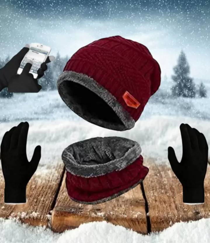 Unisex Woolen Beanie/Winter Cap & Neck Warmer Muffler Touchscreen Gloves Set