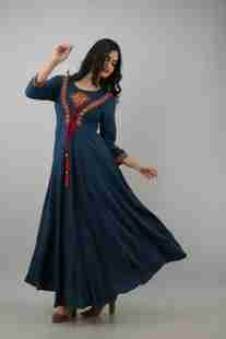 ftDiva Embroidered Cotton Rayon Stitched Anarkali Gown (Dark Blue...