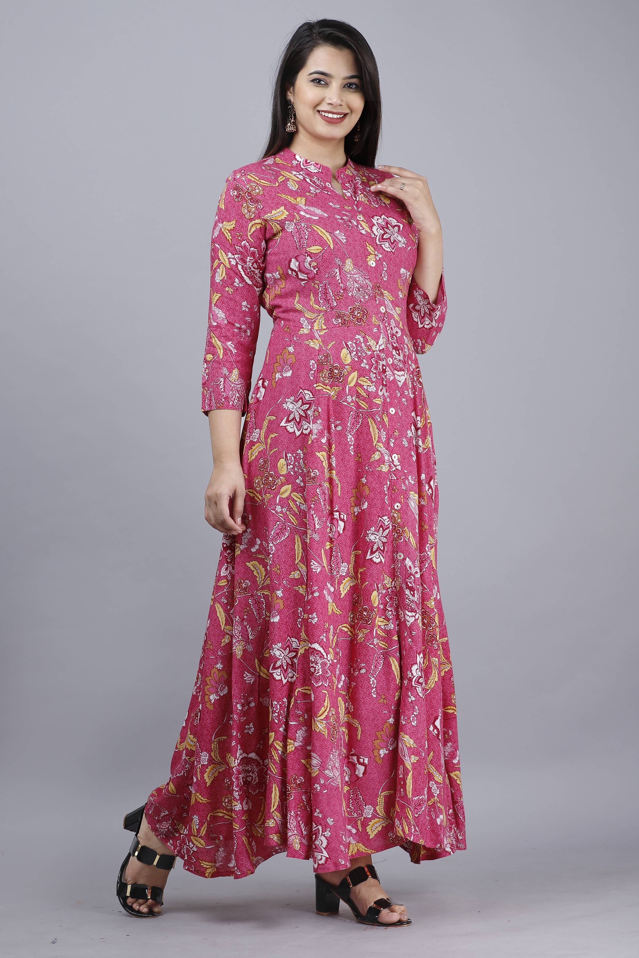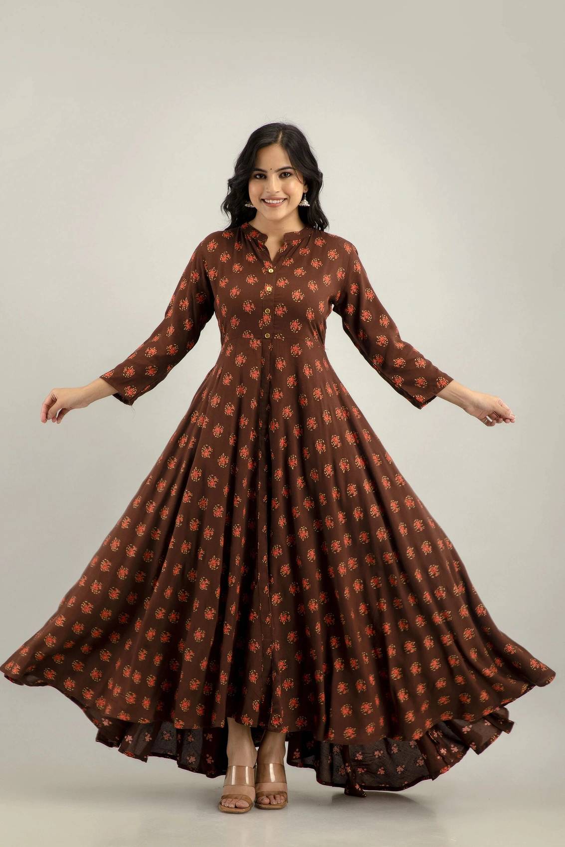 ftDiva offers you to this Flared Anarkali Gown With intricate details, kurta is designed to make you feel like royalty with its flowing silhouette, Color and Fabric.The kurta flares out from the waist, Made With Viscose Rayon, Well Finished gown and Perfect Stitched gown.This stunning Dress is Handcrafted in Jaipur & Designed for Festive Parties, Social Gatherings/Important Occasions Gives You a Complete Traditional Outlook and Help you to Easy on the eye.
