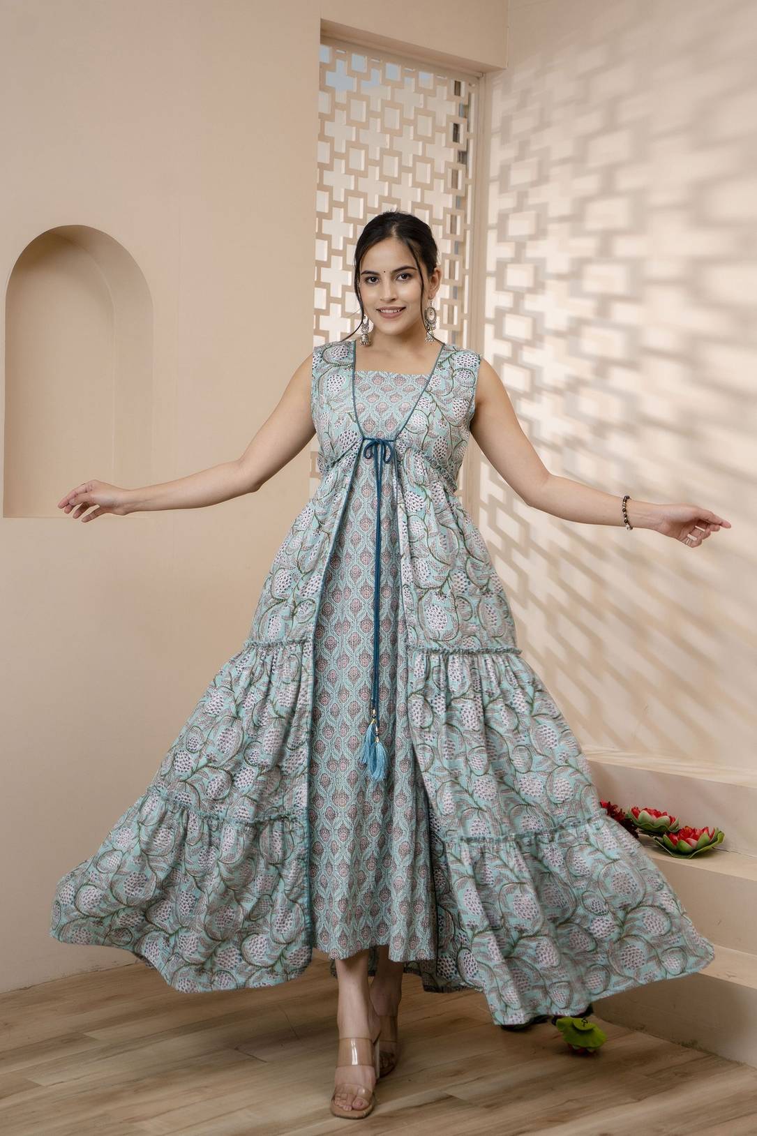 Jaipurite offers you to this beautiful Printed Anarkali Dress With Front Slit in Lite Blue Color, Made With Premium Rayon, Well Finished and Perfect Stitched,This stunning Dress is Handcrafted in Jaipur & Designed for Festive Parties, Social Gathrings/Important Occasions Gives You a Complete Traditional Outlook and Help you to Easy on the eye.