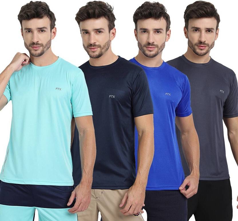 FTX Pack of 4 Men Solid Round Neck Polyester Dark Blue, Light Blue, Blue, Grey T-Shirt