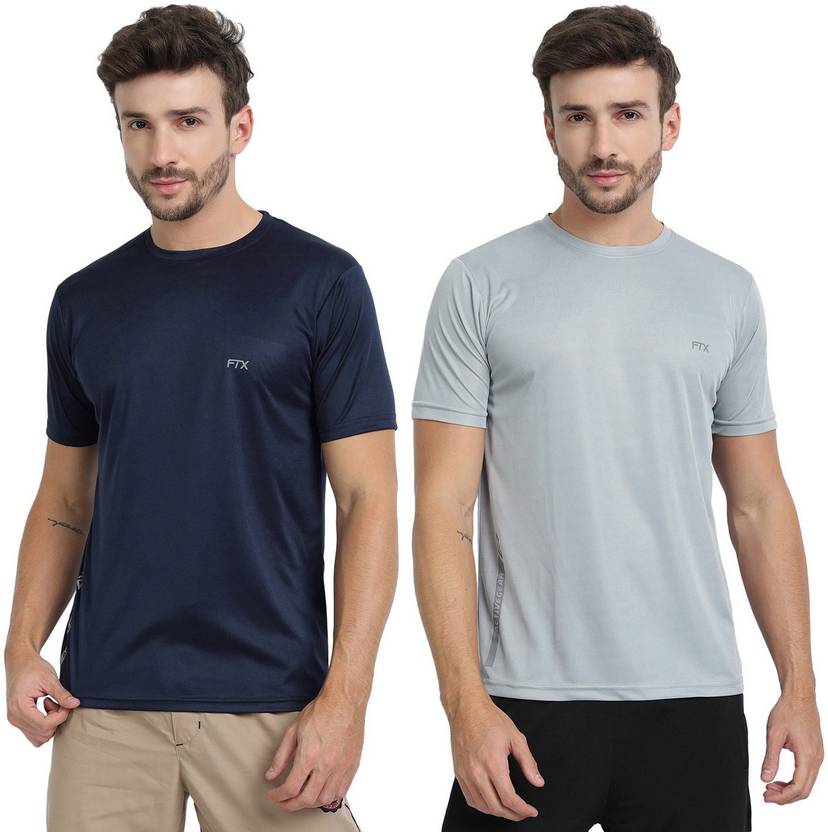 FTX Pack of 2 Men Solid Round Neck Polyester Silver, Blue T-Shirt