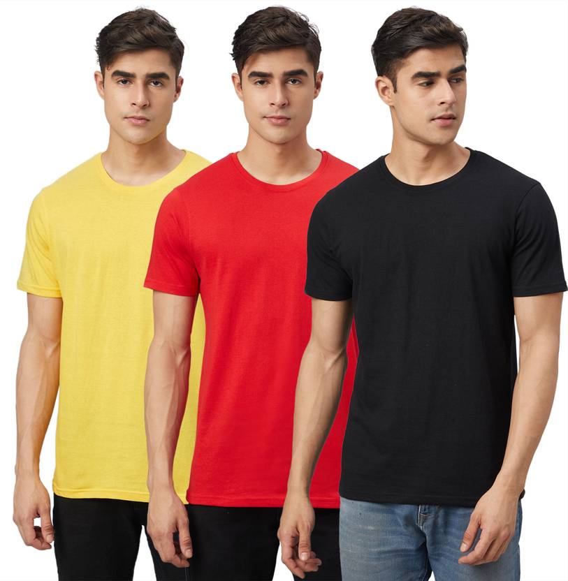 Pack of 3 Men Solid Round Neck Pure Cotton Yellow, Red, Black T-Shirt