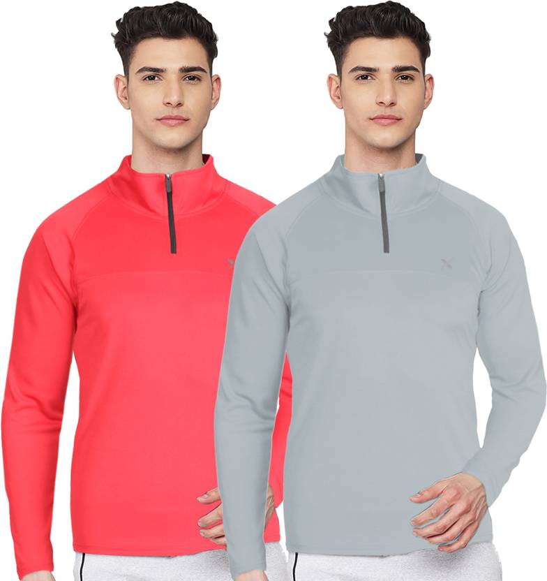 FTX Pack of 2 Men Solid Zip Neck Polyester Red, Silver T-Shirt
