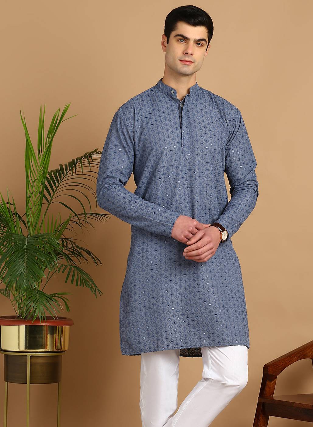 Immerse yourself in the celebration with our Festive Charm Kurta Pajama. Featuring intricate Chikankari and sequin work on Cotton Blend fabric, this set is perfect for your next engagement or wedding event. This dazzling pair of Kurta Pyjama adds a touch of elegance to your appearance, ensuring you stand out amidst the festive fervour.