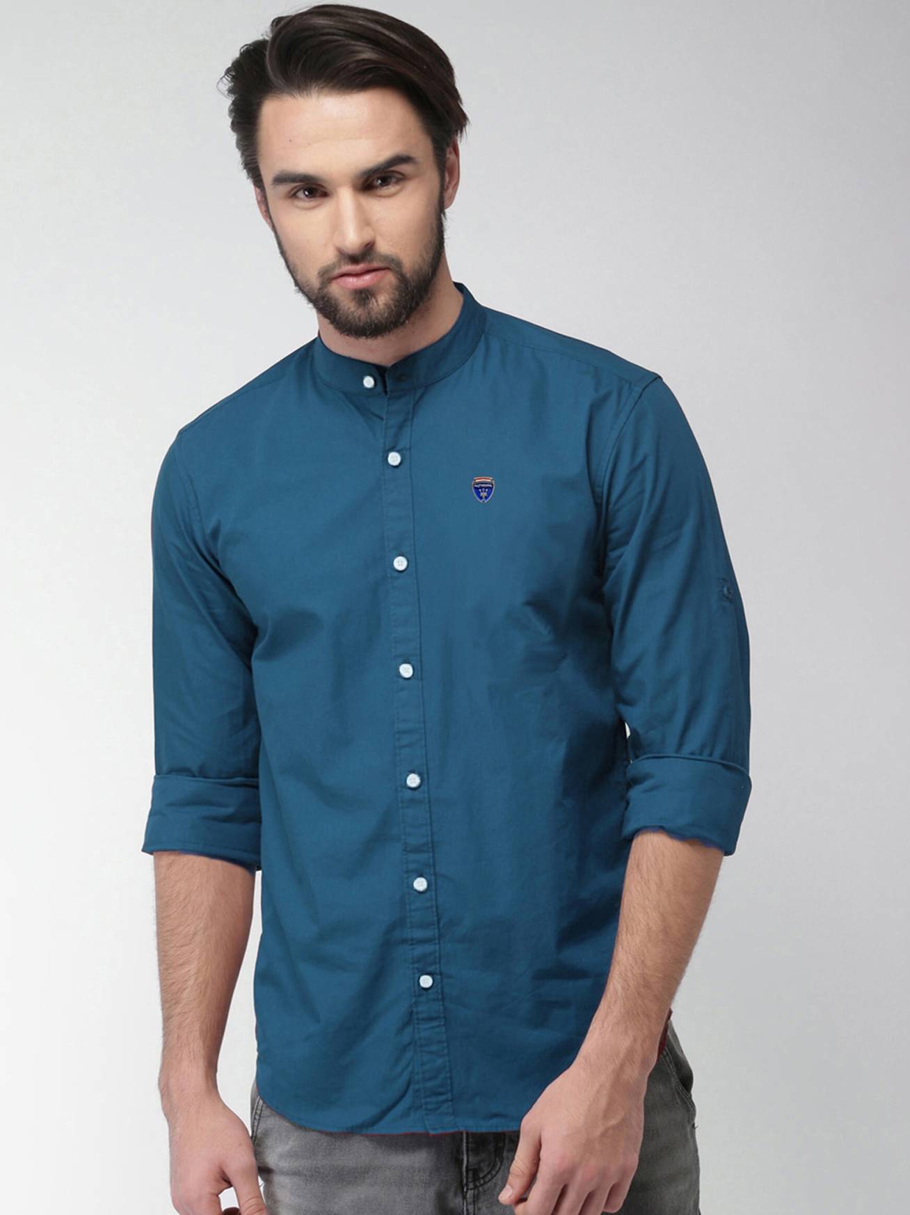 This is a best Casual wear Shirt with Mandarin collar , long sleeves with button cuffs , full buttoned placket on the front, yoke on the back, Curved. Pair this along with a good pair of denim or chinos and loafers for a Sharp and Dapper look.