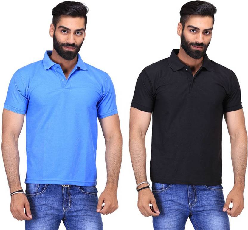 FUEGO Pack of 2 Men Solid Polo Neck Cotton Blend Light Blue, Black T-Shirt