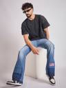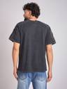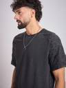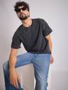 This oversized charcoal-washed t-shirt features 100% cotton fabric, a ribbed crew neck with raw edges, raglan short sleeves, and oxygen bubble embroidered patchwork details on the sleeves for a relaxed fit.