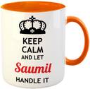 Furnish Fantasy Keep Calm and Let Saumil Handle It Ceramic Coffee - Best Birthday Gift for Son, Daughter, Brother, Sister, Gift for Friends - Color - Orange, Name - Saumil Ceramic Coffee Mug (350 ml)