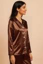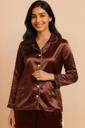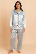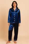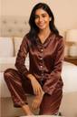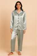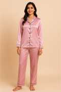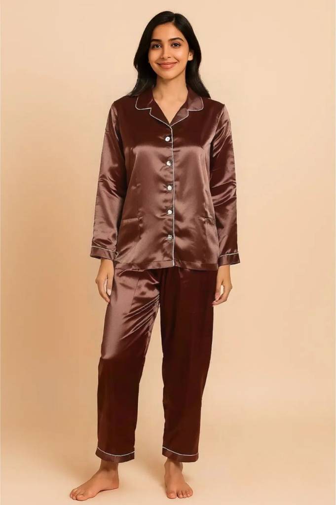 Indulge in luxurious comfort with this elegant women's satin night suit, designed to elevate your nighttime routine. Crafted from smooth, high-quality satin fabric, the set features a soft, button-down shirt with a classic collar and long sleeves, paired with relaxed-fit pyjama bottoms that offer a gentle drape and a flattering silhouette.