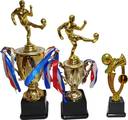 Colour, Golden, Material, Fiber with metallic gold coating, Package quantity, 3 trophies with base and Color Ribbon with Sticker, Height, Champion- 10.5'' with 2" base, Total 12.5" / Runner Up- 9'' with 2" base, Total 11" / Best Player- 6.5" with 2" base, Total 8.5"