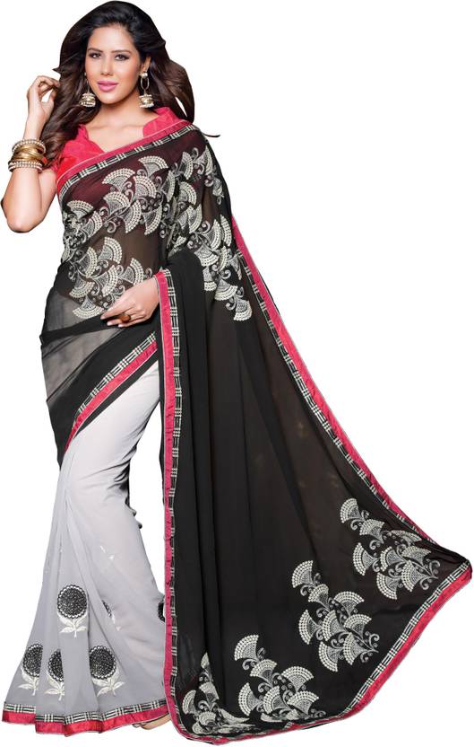 G-Tex Prints Embroidered Bollywood Georgette Saree (White, Black)