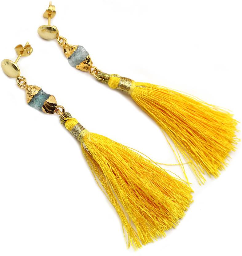 This dangler natural raw aquamarine stone amazing earring made by brass material and 24K gold plating thats give it to rich look. This contemporary aquamarine stone earring theme give you a glamorous look in the crowd. G-Vogue - We known for beautiful, intricate and unique design silver and fashion jewellery. Our each piece is a beauty that is meant to be beholded. Made with semi-precious or cultured gemstones and set in silver and metal, each collection merges fashion trends and design sensibilities to create contemporary pieces that will delight the senses. The match made in heaven will drive you wanting more. As you enthrall the world with your trendy and exquisite look for the day.