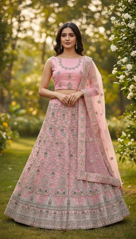 Make every occasion special with this Pink Heavy Embroidered Lehenga Choli with Dupatta from Gopinath Hand Work. Crafted with premium net fabric, this semi-stitched lehenga is adorned with intricate silver and turquoise embroidery that adds a royal touch. The matching blouse piece and elegant dupatta complete the traditional yet stylish ethnic look. Perfect for weddings, receptions, festivals, parties, and engagements, this lehenga blends comfort with designer appeal, making it a must-have for your festive wardrobe.