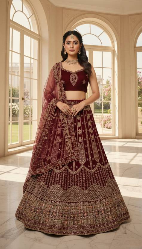 Elevate your ethnic wardrobe with this gorgeous ice blue lehenga choli set that radiates freshness and grace. Crafted frvelvet fabric, this lehenga showcases exquisite silver thread embroidery in floral and leaf patterns, offering a delicate sparkle perfect for daytime events. The blouse features matching embroidery and is paired with a sheer dupatta finished with an elegant embroidered border. Ideal for festive wear, haldi, mehendi, sangeet, and reception parties