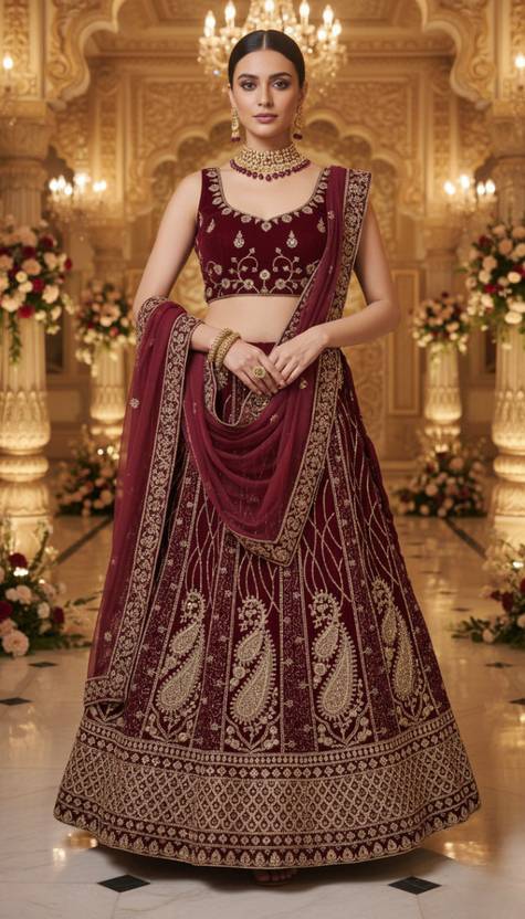 Elevate your ethnic wardrobe with this gorgeous ice maroon e lehenga choli set that radiates freshness and grace. Crafted from premium net fabric, this lehenga showcases exquisite silver thread embroidery in floral and leaf patterns, offering a delicate sparkle perfect for daytime events. The blouse features matching embroidery and is paired with a sheer dupatta finished with an elegant embroidered border. Ideal for festive wear, haldi, mehendi, sangeet, and reception parties
