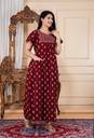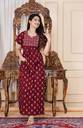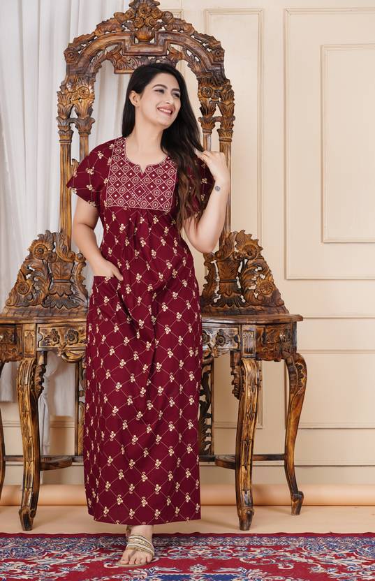 FREE SIZE FIT TO BUST 40-L/42-XL/44-XXL, Put on this brand-new, fashionable cotton nightgown with a round neck, half-comfortable sleeves, and an embroidered yoke pattern. It is one of the best options for restful sleep because of its smooth and calming feel. 54 INCH IS THE LENGTH