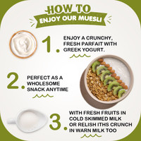 Beyond breakfast, this muesli can function as a wholesome snack, suitable for any time of the day. Its high-quality ingredients, include almonds, raisins, pineapple, and mango crush. It offers a delightful blend of textures and flavours to satisfy cravings while providing essential nutrients. Also, it can be your ally in weight management with a sugar-free and high-fibre formulation, controlling hunger pangs to maintain a balanced diet. Moreover, no cholesterol can make it a heart-healthy choice for overall well-being. Vegetarians can also make it a valuable addition to their daily routine.
