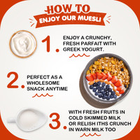 Whether you're a health enthusiast or simply looking for variety in your diet, this delicious muesli can cater to all your needs. Also, it is vegetarian, and free from cholesterol, making it a suitable choice for wide dietary preferences. You may enjoy it with a splash of milk and a drizzle of honey for a quick, satisfying and nutritious meal. Therefore, it can be ideal for busy mornings, making it your go-to cereal for bidding goodbye to your breakfast blues.