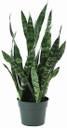 Sansevieria are evergreen perennials that can grow anywhere from eight inches to 12 feet high. Their sword-like leaves are approximately two feet long. The foliage is stiff, broad, and upright, in a dark green color variegated with white and yellow striping
